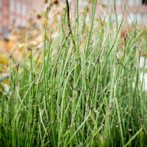 Horsetail can be planted in medium to wet soils and is tolerant of many soil conditions, capable of growing even in 4” of standing water. Horsetail prefers areas that receive full sun to part shade and can grow to a height of 3-5 feet. Consider using this plant in a water garden.