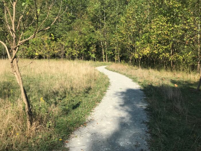 The accessible trail meanders through a meadow and along the edge of a forest bordering Brush Creek.