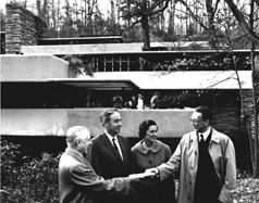 WPC President Charles Lewis (left) accepts the deed for Fallingwater from Edgar Kaufmann jr. (right). Pa. Gov. William Scranton and his wife, Mary, attended the 1963 dedication ceremony.